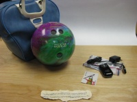The reward is a leather bag containing a green-and-purple bowling ball and evidence bag. The clown name and a phone number are engraved onto the ball. The evidence bag contains a cell phone, charger, Joker card, and a message from the Joker instructing the participant to call the phone number on the ball to complete the task.