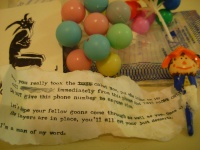 The package is a cake with a phone number on it. By calling the number, a phone inside the cake will ring. After digging into the cake, the participant will find an evidence bag with a cell phone, Joker card, cell phone charger, and a note: